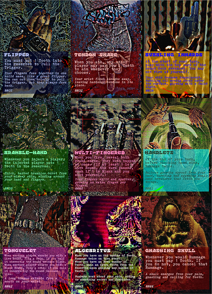 On your turn you aim that wretched Aim Card [RR00] at an opponent and flip over the top card of the Chamber Deck. Firing your gun with a BANG! Let's hope it's not a blank, but if you think it might be, you could always aim that gun at your own rotten head. But be careful, if you blow your dome sky-high you might lose a Tooth...